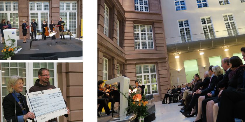 Bruder Andreas konnte als Vertreter der Deutschen Franziskanerprovinz an diesem Abend einen Scheck von 19.480,- Euro für die Suppenküche Pankow in Empfang nehmen. Ganz besonders bedankte er sich bei allen Beteiligten, dem Varian-Frey-Quartett für seine virtuose Darbietung, Frau H. Kurze, der diesjährigen Präsidentin des IWC und allen Freundinnen für ihr organisatorisches Engagement und der Deutschen Bank als Gastgeber des Konzertes.